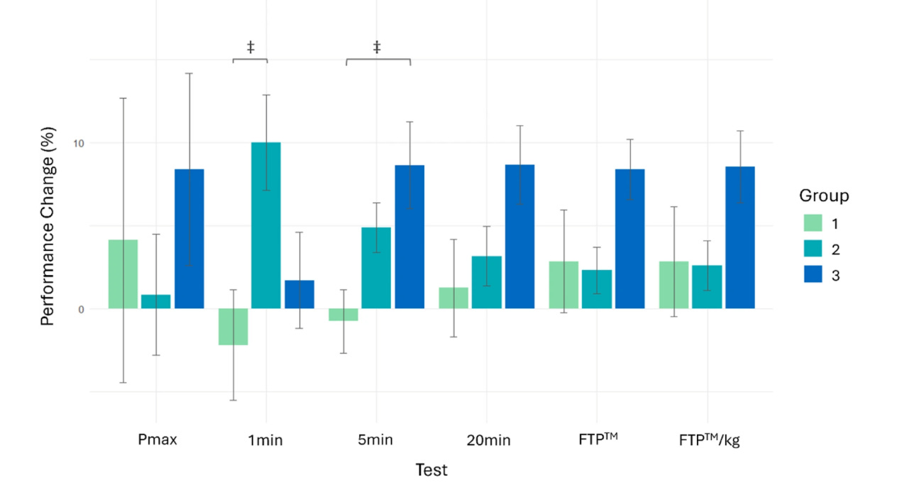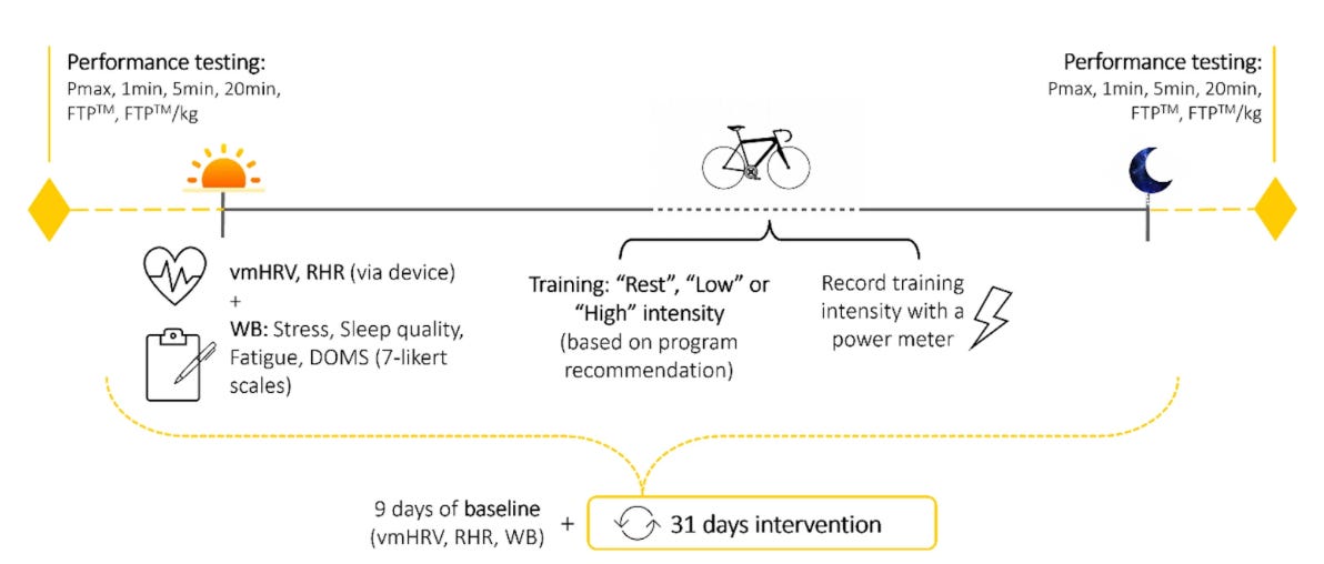 Each morning, athletes logged vmHRV and WB; some also captured RHR. The program told them whether to go High, Low, or Rest that day. Pre-/post- tests covered Pmax, 1-, 5-, and 20-min power.